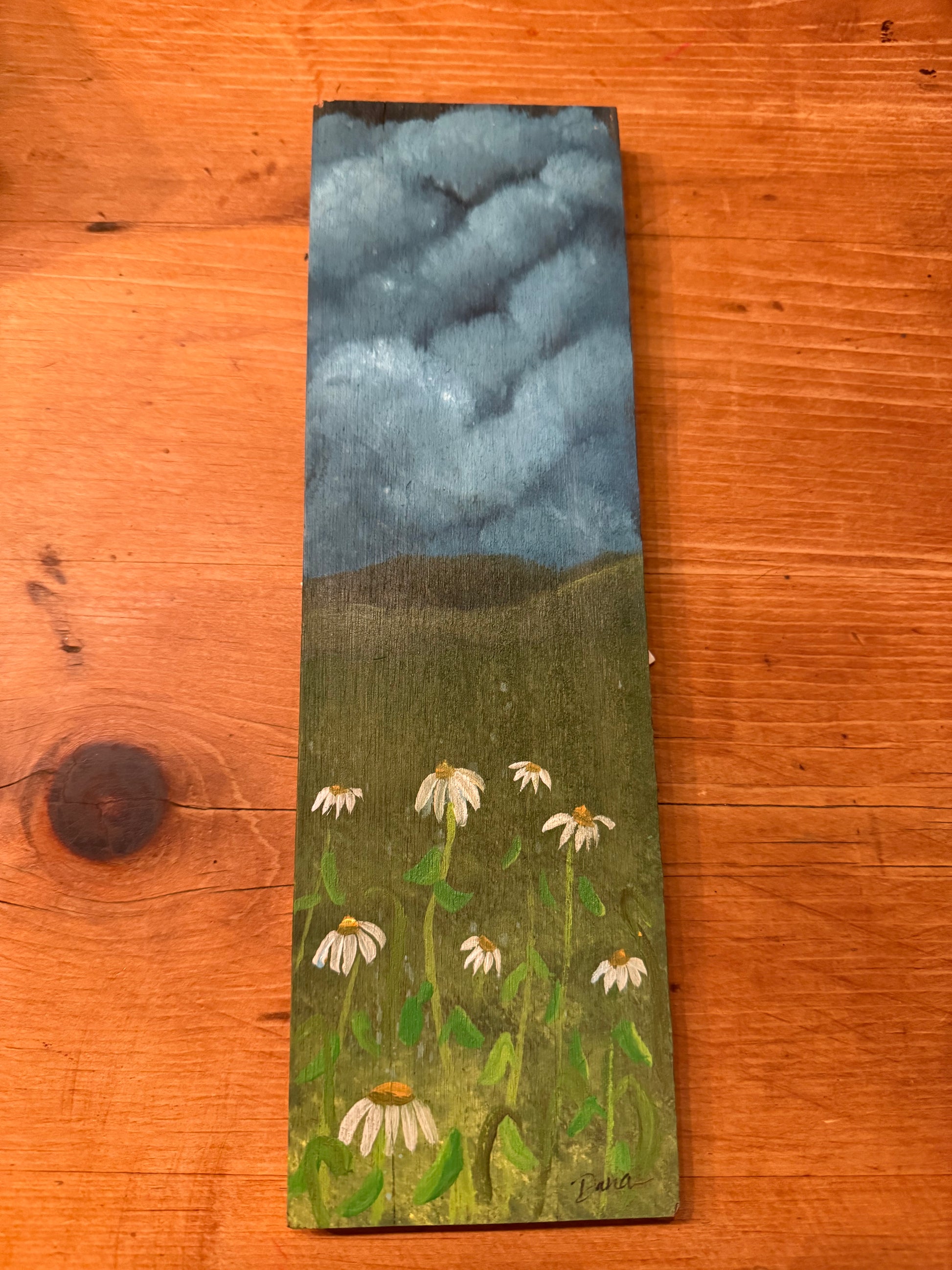 This piece is part of my Stormy Skies Series and shows a little field of wild daisies swaying under a deep, moody sky. I painted it on a reclaimed board so the natural grain could run through the clouds and the meadow. It has that quiet, breezy Finger Lakes feeling right before a storm moves in.