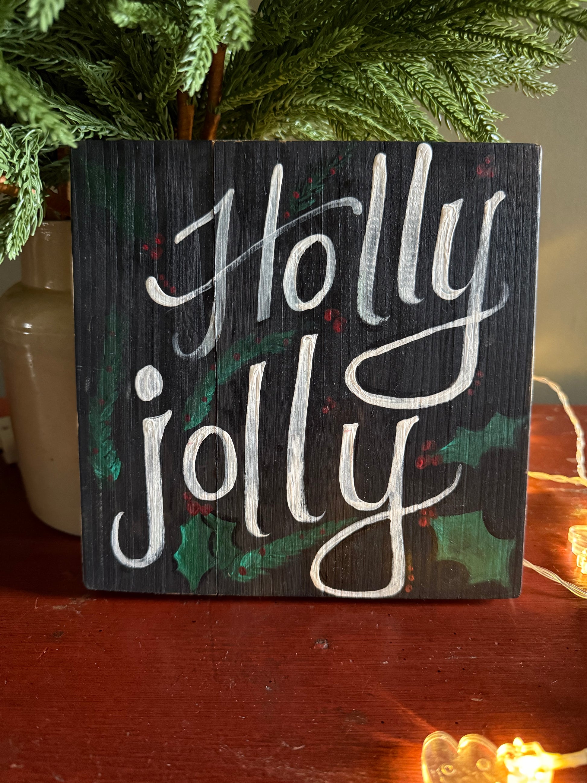 Hand-painted ‘Holly Jolly’ sign on rustic wood — the sweetest way to brighten up your Christmas corners.