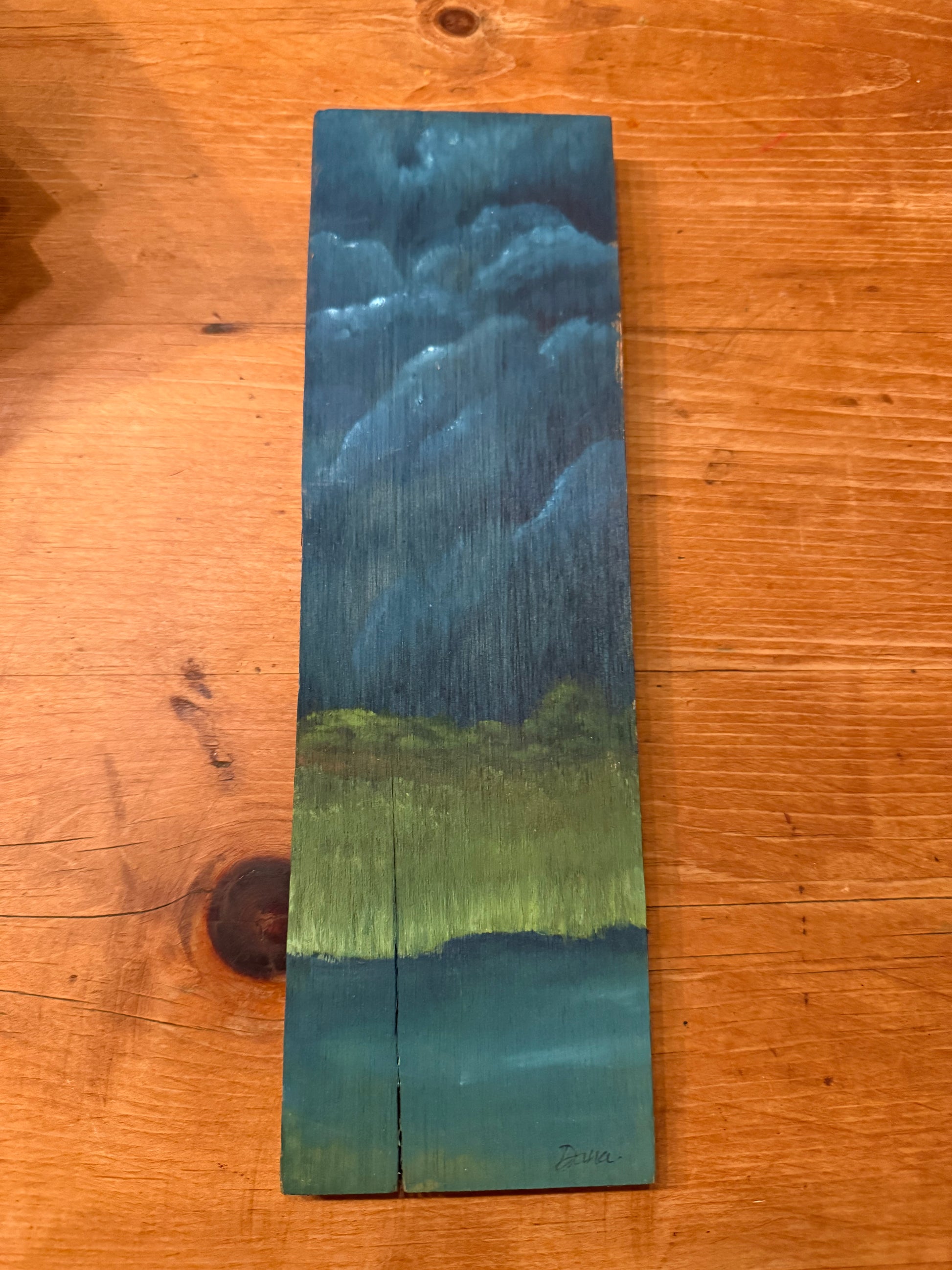 This piece is part of my Stormy Skies Series and shows a dark blue storm rolling in over a quiet ridge. I painted it on a tall piece of salvaged wood so the grain could run through the clouds and the fields below. It has that deep, dramatic Finger Lakes sky that shows up right before the rain hits.