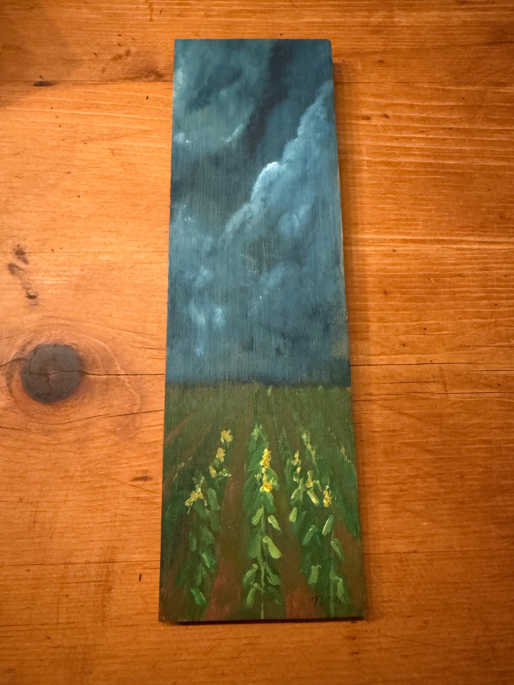 This piece is part of my Stormy Skies Series and shows a summer storm moving over rows of field corn. I painted it on a reclaimed board so the grain would run through the sky and the crops, giving it that natural, rustic texture. It feels like one of those quiet moments out in the Finger Lakes when the wind drops and you know the rain is on its way.