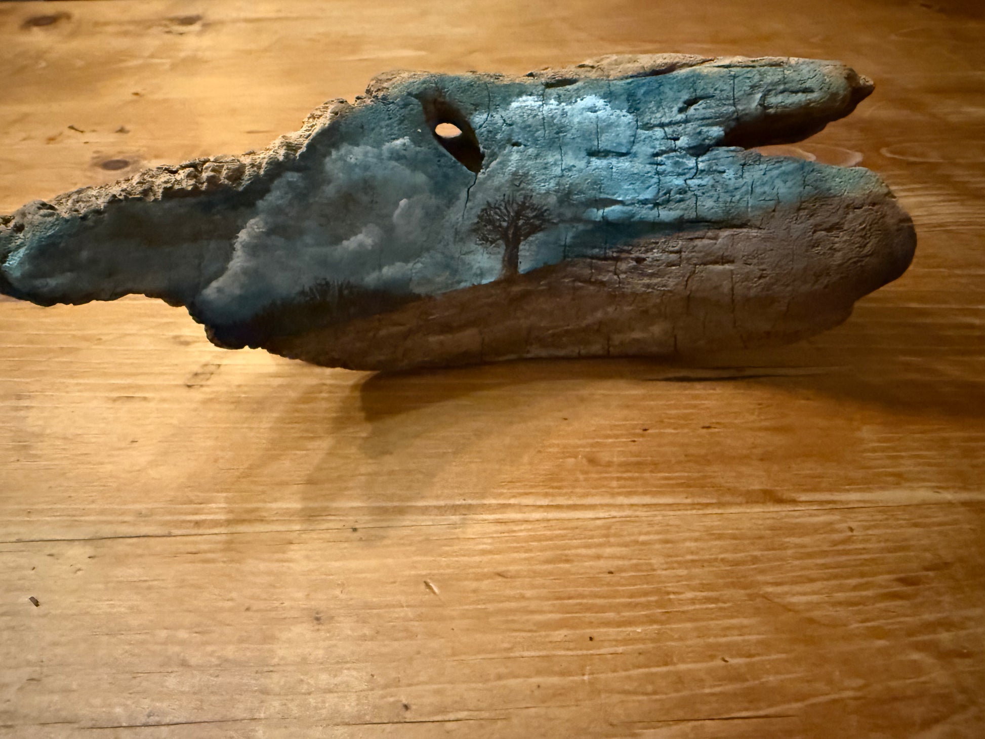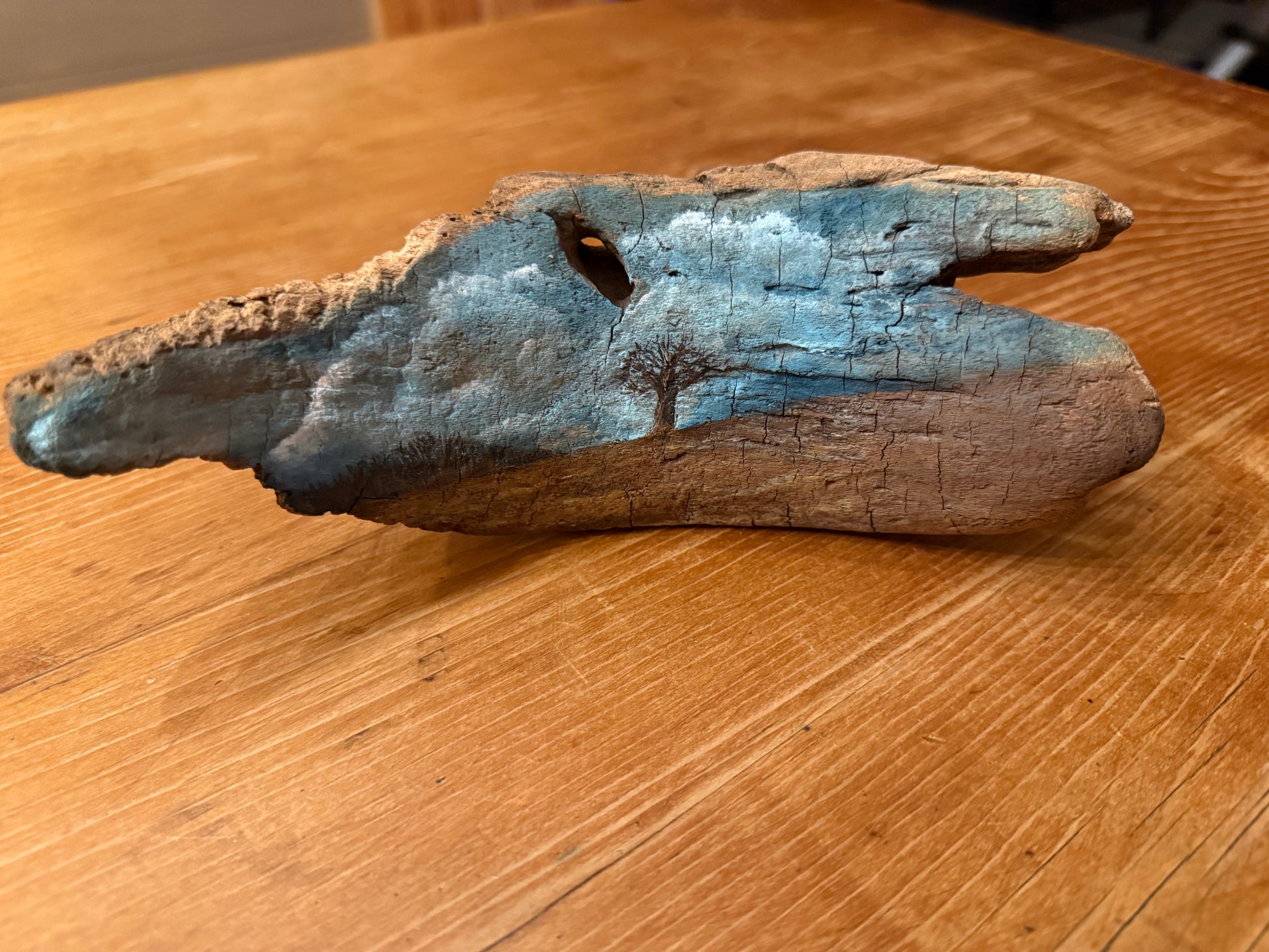 This one-of-a-kind piece highlights the raw cracks, textures, and contours of the wood, transforming its weathered surface into a miniature landscape full of depth and calm. Perfect for shelves, mantels, or small spaces that need a touch of rustic serenity.